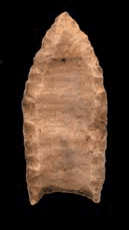 A typical Clovis point is a medium to large lance point with sharp edges, a third of an inch thick, one to two inches wide, and about four to five inches long. Sides show careful pressure flaking along the blade edge. The broadest area is towards the base which is distinctly concave with concave grooves called “flutes” removed from one or, more commonly, both surfaces of the blade. The lower edges of the blade and base are ground to dull edges for attachment to a spear.